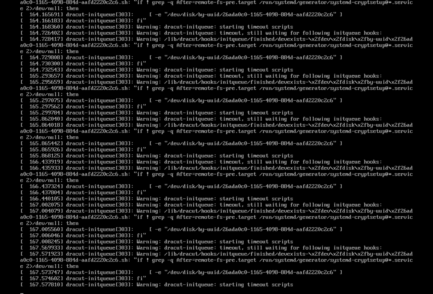 Anyway, after the encryption / timeout messages are spammed for another couple of minutes, I finally get to messages where the system appears to stop a number of services and unmount volumes.
